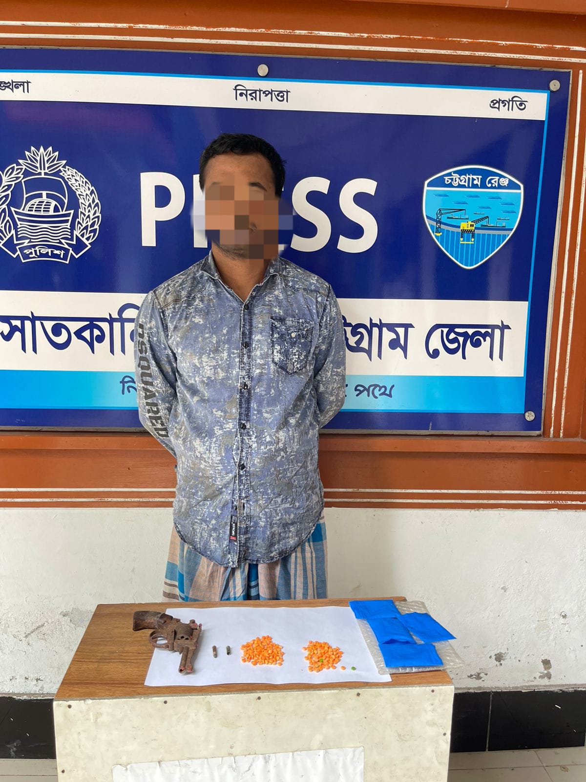 ৫আগস্ট মঙ্গলবার দিবাগত রাত সাড়ে ১০টার দিকে বিশ্বস্ত সূত্রে গোপন সংবাদের ভিত্তিতে এসআই(নিরস্ত্র) মোঃ বেলাল হোসেন ,সঙ্গীয় অফিসার ফোর্স এবং থানা এলাকায় নিয়োজিত সেনাবাহিনীর টহল দলসহ সাতকানিয়া থানাধীন ১৬নং সাতকানিয়া সদর ইউপির ০২নং ওয়ার্ডের অর্ন্তগত করাইয়া নগর সাকিনের চাটগা পাড়া লায়লার বর বাড়ীস্থ আসামী জানে আলম এর ২য় তলা বসত বিল্ডীংয়ের নীচ তলায় পশ্চিম পার্শ্বের কক্ষে বিশেষ অভিযান পরিচালনা করিয়া আসামী মোঃ জানে আলম (৪০), পিতা-ছালেহ আহমদ, মাতা-চেমন আরা বেগম, এনআইডি-৮২৩৪১৯১৭৬৮, সাং-করাইয়া নগর, চাটগা পাড়া, লায়লার বর বাড়ী, ০২নং ওয়ার্ড, ১৬নং সাতকানিয়া সদর ইউপি, থানা-সাতকানিয়া, জেলা-চট্টগ্রামকে গ্রেফতার করা হয় এবং তাহার হেফাজত হইতে ০১(এক) টি কাঠের বাটযুক্ত পুরাতন বিদেশী রিভালবার, ০১টি পুরাতন কার্তুজ, ০১টি কার্তুজের খোসা ও ২৩০ পিছ ইয়াবা ট্যাবলেট, উদ্ধার করা হয়। পরবর্তীতে আসামীর বিরুদ্ধে সাতকানিয়া থানার মামলা নং-০৩ তারিখ-০৬/০৮/২০২৫ইং, ধারা-19A The Arms Act, 1878; তৎসহ ৩৬(১) সারণির ১০(ক) মাদকদ্রব্য নিয়ন্ত্রণ আইন, ২০১৮; রুজু করা হয় বলে থানা সূত্রে জানা যায়।