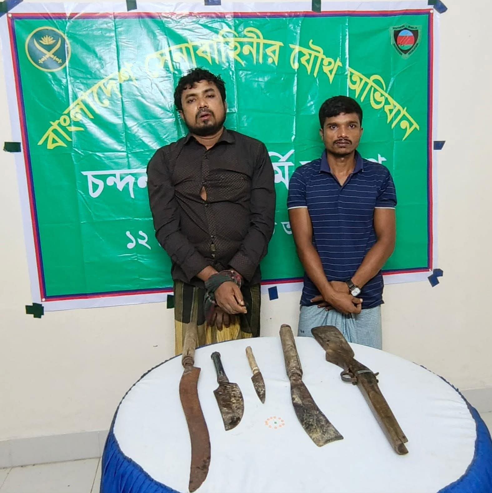 চন্দনাইশে সেনাবাহিনীর অভিযানে সন্ত্রাসী ও ইয়াবা ব্যবসায়ী লিয়াকত আলী ও তার সহযোগী গোলাপ রহমান অস্ত্র ইয়াবাসহ আটক।