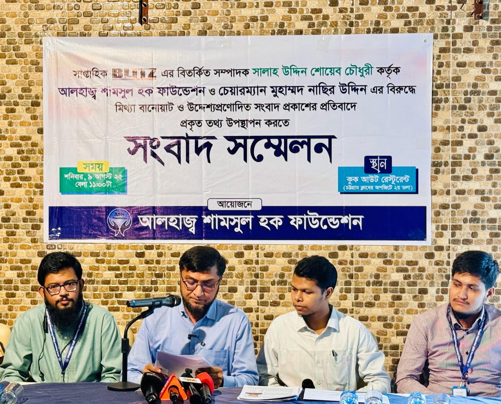 সংবাদ সম্মেলনে তিনি বিতর্কিত সাংবাদিক সালাউদ্দিন শোয়েব চৌধুরীর বিরুদ্ধে ‘মানহানিকর ও বিদ্বেষমূলক’ প্রতিবেদন প্রকাশের অভিযোগ আনেন। তার দাবি, ব্লিটজ পত্রিকায় কোনো প্রমাণ ছাড়াই ফাউন্ডেশনকে পাকিস্তানি আইএসআই ও জঙ্গি নেটওয়ার্কের সঙ্গে যুক্ত করা হয়েছে।