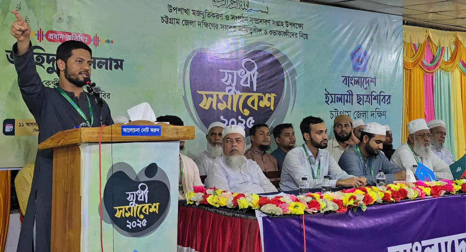 ছবির ক্যাপশন: চট্টগ্রামের সাতকানিয়ায় সুধী সমাবেশে বক্তব্য রাখছেন ইসলামী ছাত্রশিবিরের কেন্দ্রীয় সভাপতি জাহিদুল ইসলাম। মঞ্চে শাহজাহান চৌধুরীসহ অন্যান্য নেতৃবৃন্দ উপস্থিত।