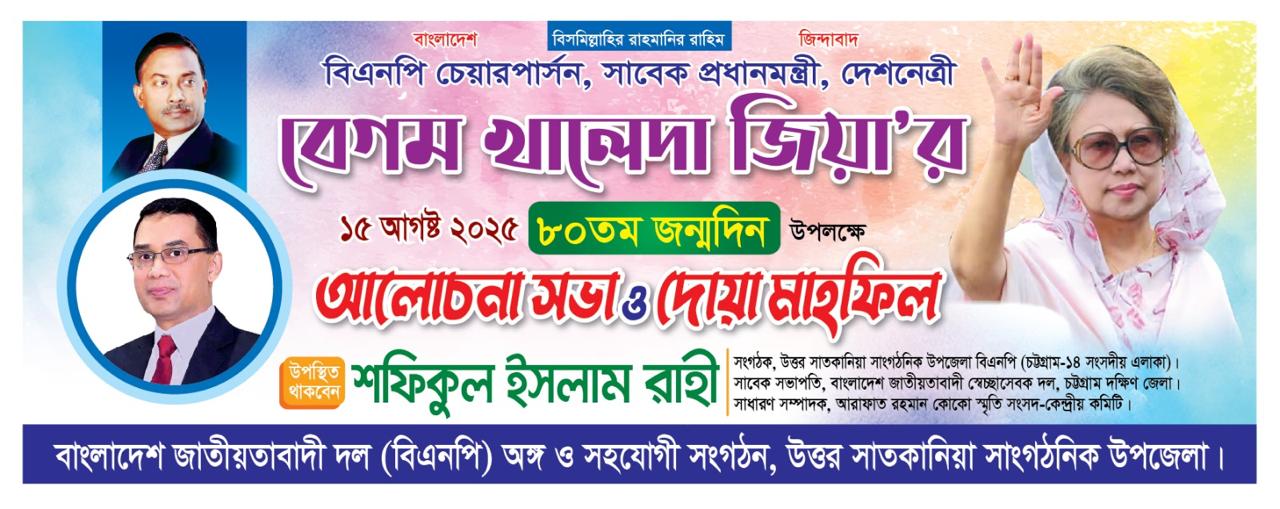 আগামীকাল ১৫ আগস্ট ২০২৫ জুমাবার আছরের নামায আমরা সবাই একসাথে কালিয়াইশ ইউনিয়নের মৌলভীর দোকান ও বিওসি মোড়ের মাঝখানে ,চট্টগ্রাম কক্সবাজার মেইন রোড়ের পশ্চিমে মিয়া খলিলুর রহমান জামেমসজিদে আদায় করে মসজিদের মাঠে বিএনপি চেয়ারপারসন বেগম খালেদা জিয়ার ৮০তম জন্মদিন উপলক্ষে উত্তর সাতকানিয়া সাংগঠনিক উপজেলা বিএনপির দোয়া মাহফিলে অংশগ্রহণ করবো ইনশাআল্লাহ। সকলের আন্তরিক উপস্থিতি কামনা করছি। (শফিকুল ইসলাম রাহী )