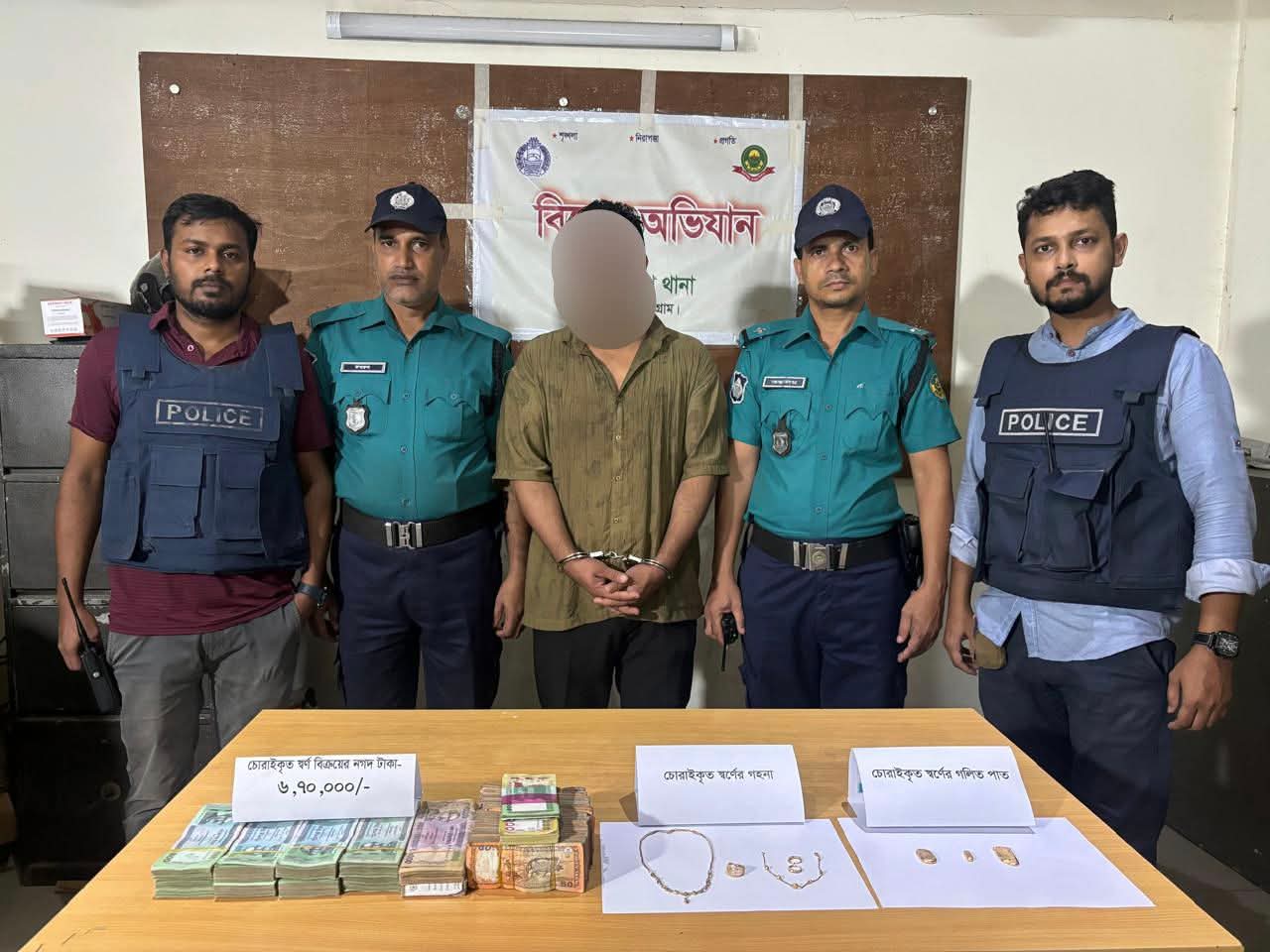 পরবর্তীতে, মামলার তদন্তকারী কর্মকর্তা এসআই মোঃ আল-আমিন খান সঙ্গীয় অফিসার-ফোর্সসহ তথ্য প্রযুক্তির সহায়তায় ইং ২২/০৯/২০২৫ তারিখ রাত অনুমান ০১.৩০ ঘটিকার সময় পাঁচলাইশ মডেল থানাধীন রহমান নগর বি-ব্লক এলাকায় অভিযান পরিচালনা করে এজাহার নামীয় আসামী মিজানুর রহমান (৩২) কে গ্রেফতার করেন। ধৃত আসামীর দেখানো এবং নিজ হাতে উদ্ধার করা মতে মামলার চোরাই যাওয়া স্বর্ণালংকার—০১টি নেকলেস, ০১টি ব্রেসলেট,০১ জোড়া কানের দুল, ০১টি আংটি সহ মোট ওজন ২ ভরি ৪ আনা স্বর্ণালংকারউদ্ধার করেন। গ্রেফতারকৃত আসামীকে বিজ্ঞ আদালতের অনুমতিক্রমে ইং২৩/০৯/২০২৫ তারিখের দুই দিনের পুলিশ হেফাজতে নিয়ে মামলার বিষয়ে ব্যাপক ও নিবিড় জিজ্ঞাসাবাদ করা হয়। জিজ্ঞাসাবাদের প্রেক্ষিতে আসামীর স্বীকারোক্তি মতে মামলার আইও সঙ্গীয় অফিসার-ফোর্সসহ চান্দগাঁও থানাধীন খাজারোড চিটাগাং টাওয়ার (১১ তলা) ভবনের বাসার আলমিরীর ড্রয়ার থেকে আসামীর দেখানো মতে নগদ ১,২০,০০০/- (এক লক্ষ বিশ হাজার) টাকা উদ্ধার করেন। পরবর্তীতে, বর্ণিত আসামী কর্তৃক চোরাইকৃত স্বর্ণ বিক্রিত দোকানগুলোতে অভিযান পরিচালনা করা হয়। এপ্রেক্ষিতে চান্দগাঁও থানাধীন মোহরা এলাকার কাজিরহাটস্থ চট্টল সুন্দরী জুয়েলার্সে ৪ ভরি ওজনের ১টি স্বর্ণের গলিত পাত উদ্ধার করা হয়। আসামীর শ্বশুর বাড়ীর বর্তমান ঠিকানায় অভিযান চালিয়ে চোরাইকৃত স্বর্ণ বিক্রির নগদ ৫,৫০,০০০/- (পাঁচ লক্ষ পঞ্চাশ হাজার) টাকা উদ্ধার জব্দ করা হয়। এছাড়াও কোতোয়ালী থানাধীন কে.সি. দে রোডস্থ বিনোদনী মার্কেটের ইকোনমিক জুয়েলারী নামীয় দোকান থেকে ৪ ভরি ওজনের ১টি স্বর্ণের গলিত পাত উদ্ধার করা। উক্ত মামলা সংক্রান্তে সর্বমোট—১০ ভরি ০৪ আনা ওজনের স্বর্ণ ও স্বর্ণের গলিত পাত, নগদ ৬,৭০,০০০/- (ছয় লক্ষ সত্তর হাজার) টাকা উদ্ধার করা হয়েছে। পরবর্তীতে ধৃত আসামীকে যথাযথ পুলিশ পাহারায় বিজ্ঞ আদালতে সোপর্দ করা হয়েছে।