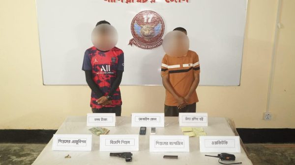 ঢাকা, ১২ অক্টোবর ২০২৫ (রবিবার): গত ১১ অক্টোবর ২০২৫ তারিখ দুপুরে সুনির্দিষ্ট গোয়েন্দা তথ্যের ভিত্তিতে পার্বত্য চট্টগ্রামের রাঙামাটি জেলার বগাছড়ি এলাকায় একটি বিশেষ চেকপোস্ট স্থাপন করে চলাচলরত যানবাহনে সেনাবাহিনী কর্তৃক তল্লাশি অভিযান পরিচালনা করা হয়। অভিযানকালে, সেনাবাহিনীর সদস্যদের উপস্থিতি টের পেয়ে চেকপোস্ট অভিমুখে আগত একটি মোটরসাইকেল প্রায় ১৫০ মিটার দূরে থেমে পালানোর চেষ্টা করে। সেনাবাহিনীর সদস্যরা দ্রুততার সাথে মোটরসাইকেলসহ দুই আরোহীকে আটক করে। প্রাথমিক জিজ্ঞাসাবাদ ও পূর্বে সংগৃহীত ছবি থেকে নিশ্চিত হওয়ার মাধ্যমে ইউপিডিএফ এর পোস্ট কমান্ডার কর্ম চাকমা ও তার সহযোগী লেলিন চাকমা’কে আটক করা হয়। পরবর্তীতে, তল্লাশি করে তাদের কাছ থেকে ০১টি পিস্তল ও ০১টি ম্যাগাজিন, ০৩ রাউন্ড অ্যামুনিশন, ০১টি ওয়াকিটকি সেট, ০২টি মোবাইল ফোন ও ০২টি চাঁদা আদায়ের রসিদ উদ্ধার করা হয়।