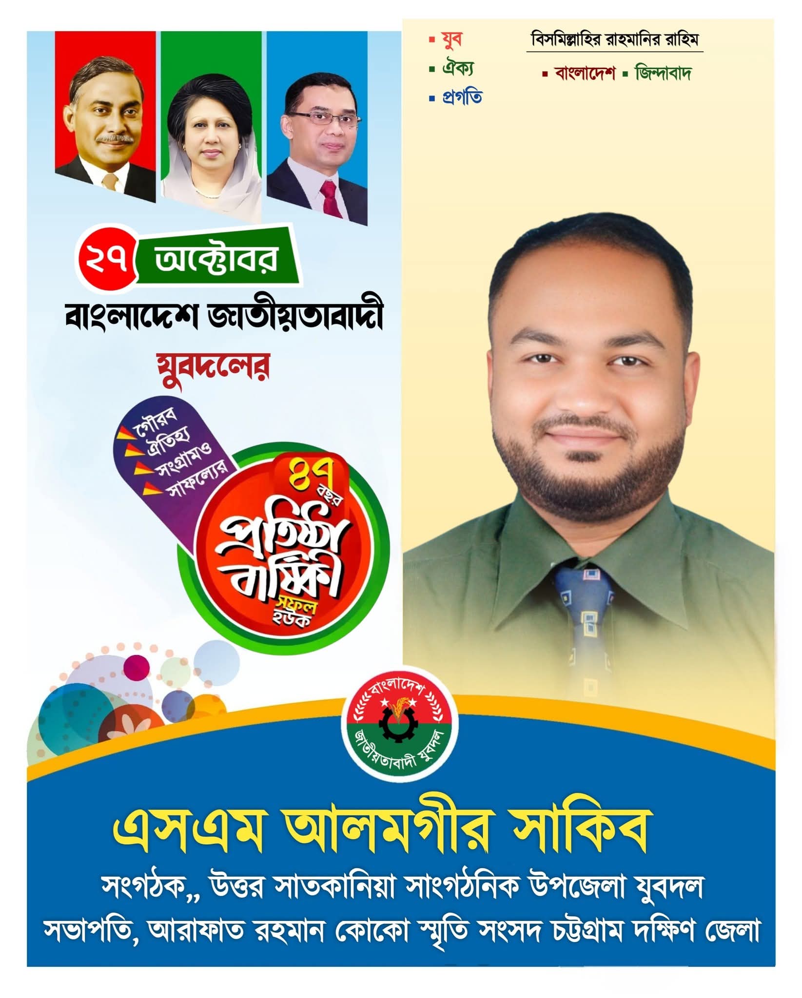 উত্তর সাতকানিয়া’বাসীকে যুবদলের ৪৭ তম প্রতিষ্ঠা বার্ষিকীর শুভেচ্ছা জানান সংগঠক এসএম আলমগীর সাকিব, সভাপতি আরাফাত রহমান কোকো স্মৃতি সংসদ চট্টগ্রাম দক্ষিণ জেলা।